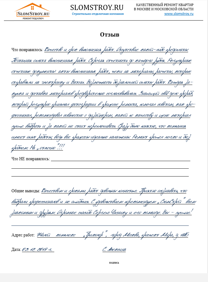 К выбору компании для ремонта нашей трехкомнатной квартиры в новостройке мы подошли очень основательно. Посмотрели около 15 компаний, но все же, по рекомендации друзей (они заказывали здесь ремонт загородного дома), решили обратиться в «СломСтрой». Заполнили форму обратной связи на сайте, через 10 мин с нами связался менеджер и мы договорились о выезде замерщика. При встрече с ним, мы оговорили все детали ремонта, остановились пока на черновых работах. На следующий день мы получили детальную смету работ, стоимость нас устроила, и мы подписали договор. В общей сложности черновой ремонт занял 35 дней, чему мы были очень рады. Качеством очень довольны, идеально ровные стены, пол, аккуратно проведенное освещение, водоснабжение, все с толком, с расстановкой. После окончания работ нам посчитали смету на чистовые работы, и мы подписали доп. соглашение на их производство. Ремонт делали без дизайн-проекта, но все наши пожелания были учтены на 100 %. Что немаловажно, стоимость всех работ была зафиксирована в смете, конечно, общая стоимость ремонта отличалась от стоимости в первоначальной смете, но это было обусловлено нашими доп. пожеланиям по ремонту. После окончания каждого этапа ремонта, мы принимали работы, прораб высылал нам в мессенджере отчетные документы и фото выполненных работ. Первые два этапа мы приезжали принимать, потом поняли, что нет смысла тратить время, ребята работают на совесть. В итоге мы смотрели фотоотчет и оплачивали работы безналом. Мы остались очень довольны выбором этой компании. Надежность, качество, скорость и невероятная клиентоориентированность – основные качества компании «Сломстрой», которые нам были очень важны. Спасибо за проделанную работу. Благодаря Вам наш ремонт прошел на одном дыхании и без нервотрепки. Браво, ребята! Обратимся к Вам еще и обязательно будем Вас всем рекомендовать.