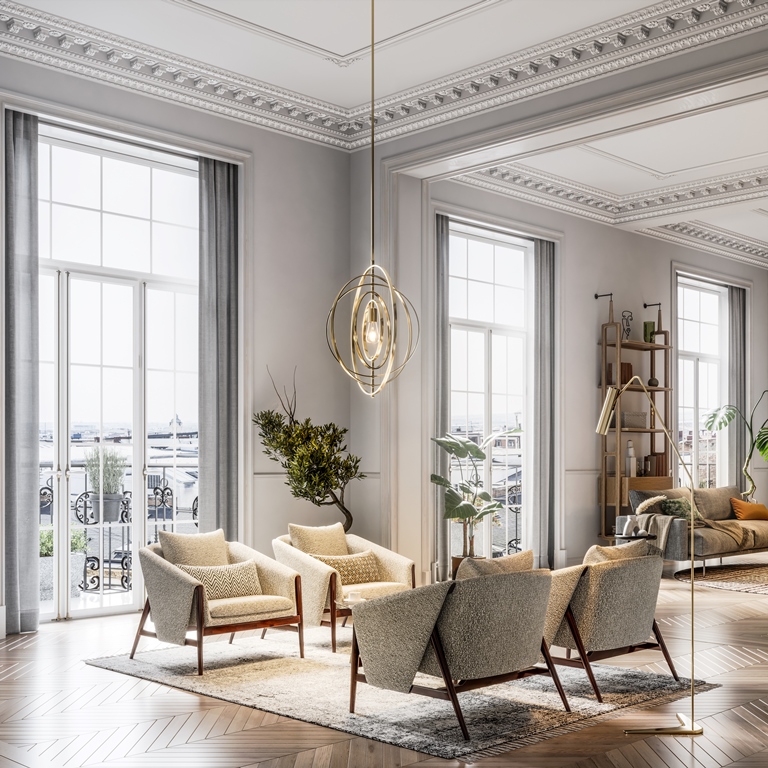 Принцип свободной планировки и открытого жилого пространства распространяется на все комнаты, кроме ванны, уборной и спален. При этом основная жилая площадь больше похожа на студию, с отсутствующими дверьми и перегородками.