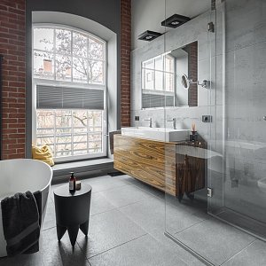 - Отказаться от множества перегородок. Ванную или душевую кабину часто размещают прямо в спальне, отделяя только туалет, а немногочисленные перегородки возводят не до потолка, чтобы сохранить ощущение открытости пространства. Зонирование пространства происходит с помощью освещения, цветов, разных покрытий и расстановки мебели.