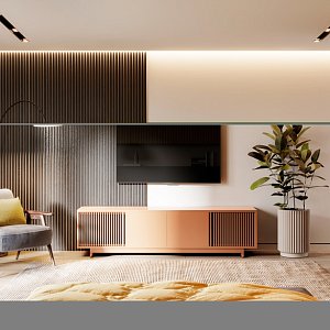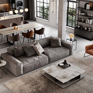 Мебель в современном стиле, монолит геометричных форм, занимающая не более 40% площади. Широко используется встроенная бытовая техника и скрытые системы хранения. Мягкая мебель — лаконичная, невысокая, с низкими спинками, не более 50см.