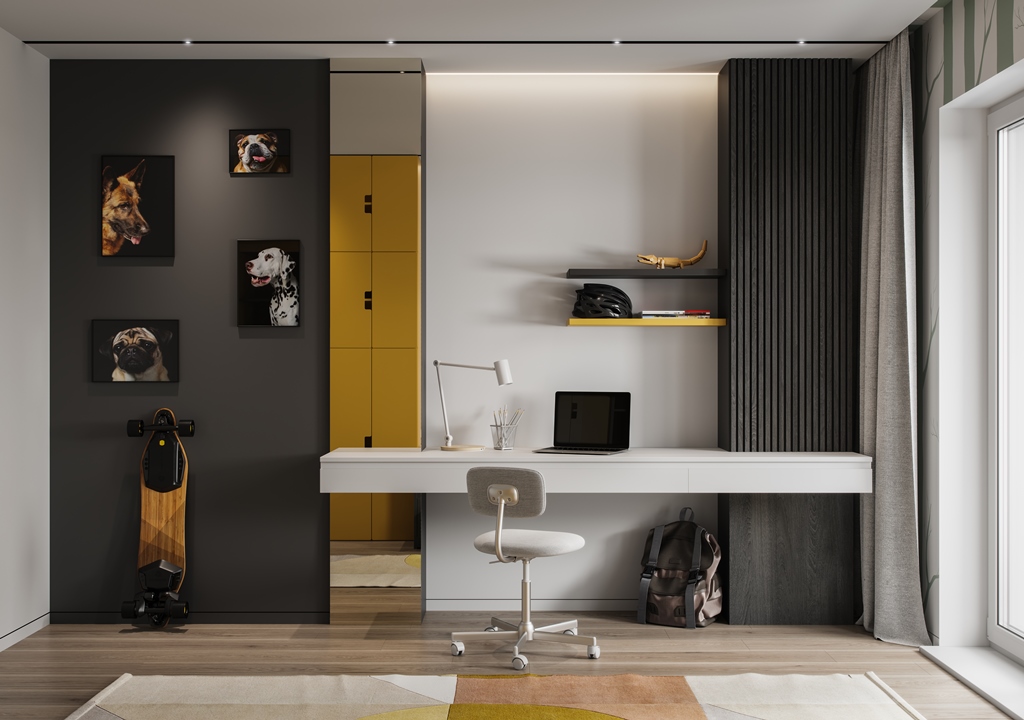 Пространство в минималистичных интерьерах это самое важное. Поэтому, к примеру, для рабочей зоны лучше заказать один многофункциональный встроенный шкаф для оргтехники, документов и профессиональной литературы, чем покупать несколько полок, стеллаж и тумбочку.