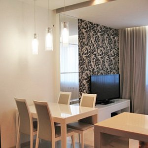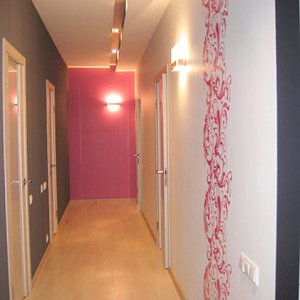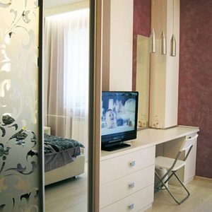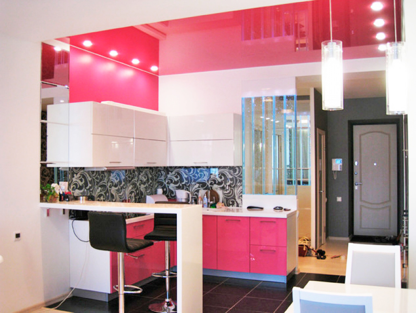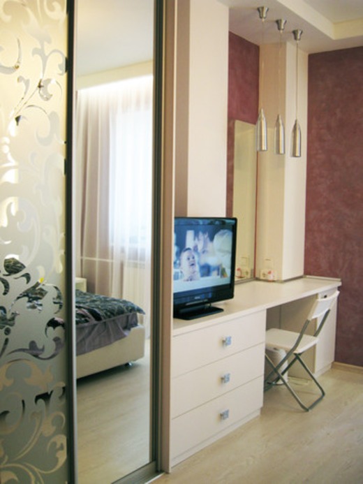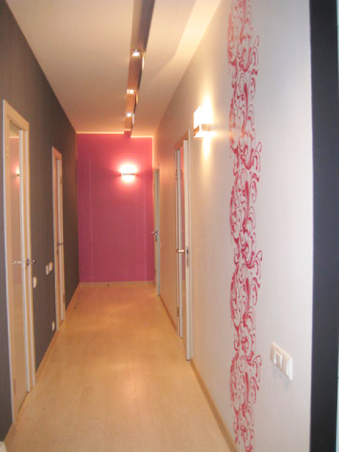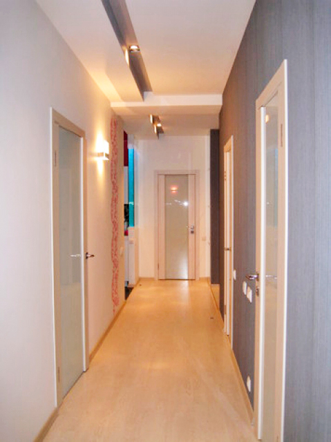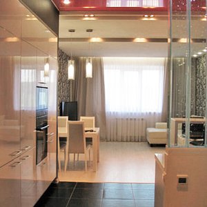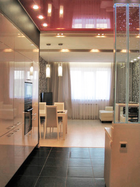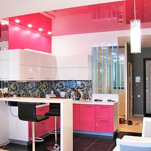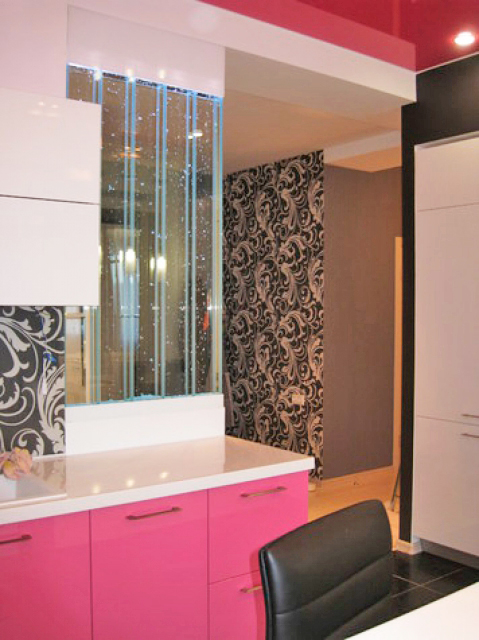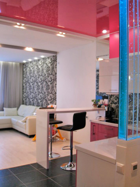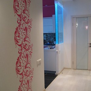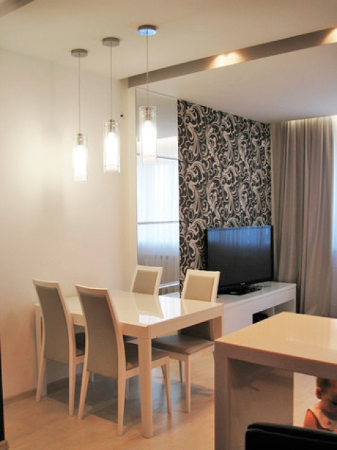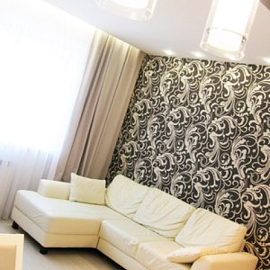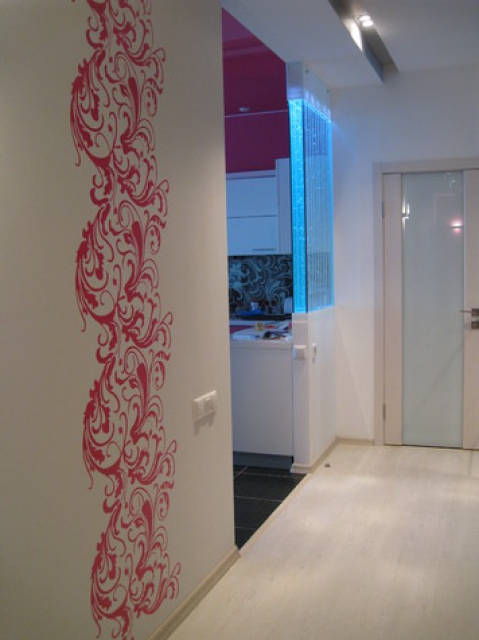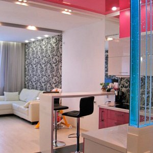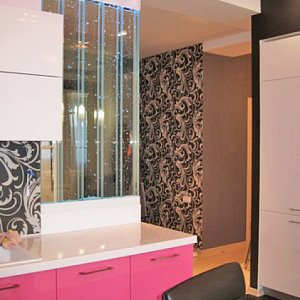 Ремонт выполнен в современном стиле. Базовый цвет – беж, классика интерьерного оформления. Нейтральный спокойный тон разбавлен яркими акцентами цвета фуксии в виде узора на стене в коридоре и кухней в том же цвете. Зона отдыха в гостиной выделена контрастными обоями с узорами и шторами в тон. Точечное освещение вместе с основным светом четко обозначают зонирование.