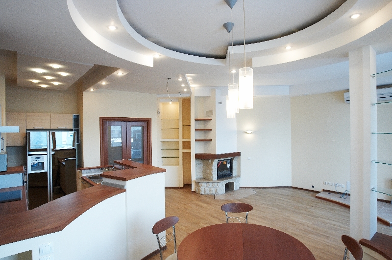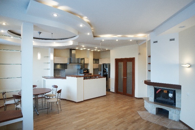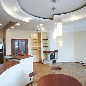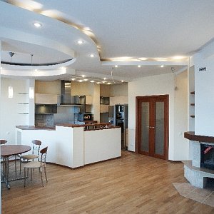 В кухне-гостиной обозначены три зоны: отдыха, обеденная зона и место приготовления пищи. В помещении все продумано до мелочей для комфорта и удобства всех членов семьи. Можно обедать, отдыхать и заниматься домашними делами без ущерба для общения. Беспроигрышный вариант – установка камина. Он создает атмосферу уюта и умиротворения, благодаря которой так приятно возвращаться домой.