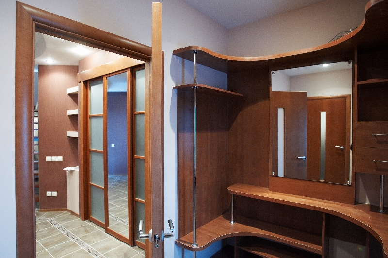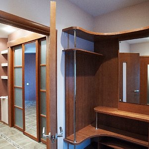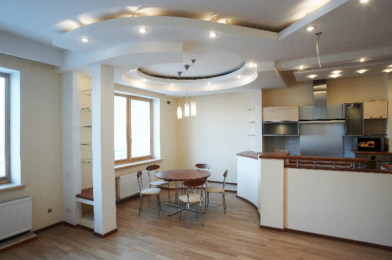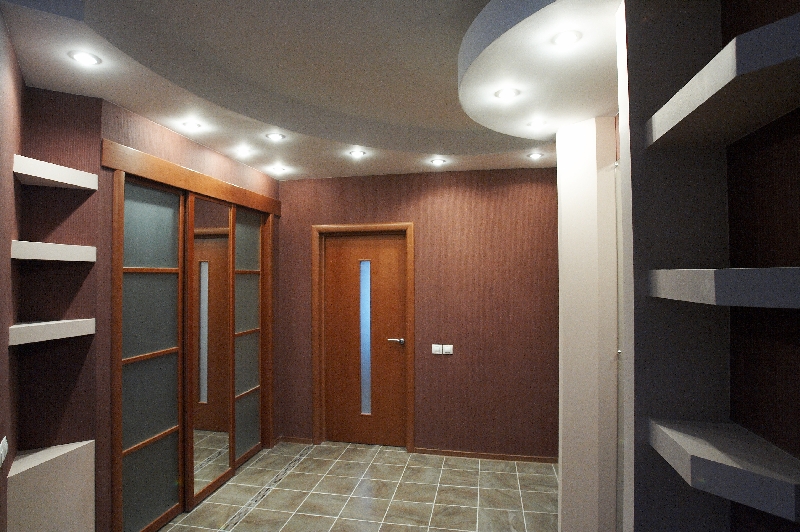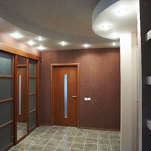 Отделка выполнена в современном стиле, в сдержанных тонах. Сочетание оливкового и шоколадного цвета в просторном холле открывает массу возможностей для дальнейшего декорирования стен. Эти тона удачно дополняют друг друга в интерьере. Двухуровневый потолок с точечной подсветкой изящными линиями подчеркивает лаконичность прихожей и продолжается в кухне-гостиной.