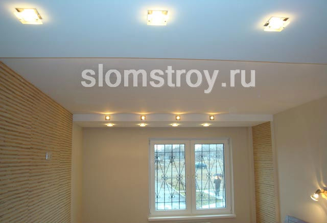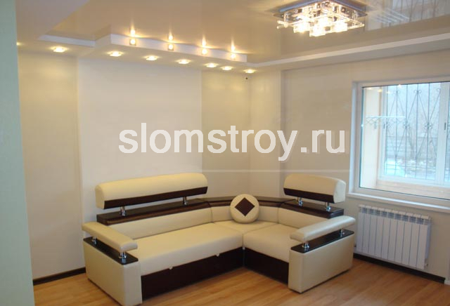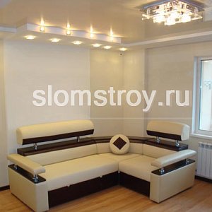 Гостиная в черно-белом исполнении – строгость и простота дизайна, минимум деталей. Выбраны белые обои под покраску без рисунка, для контраста плинтуса покрашены в черный цвет, находящий повторение в черно-белом угловом диване. Оригинальная квадратная люстра дополнена точечными светильниками, смонтированы двухуровневые потолки. Простые и четкие геометрические линии, строгие цвета, обилие света – обстановка в этой комнате создает ощущение легкости и простора.