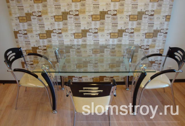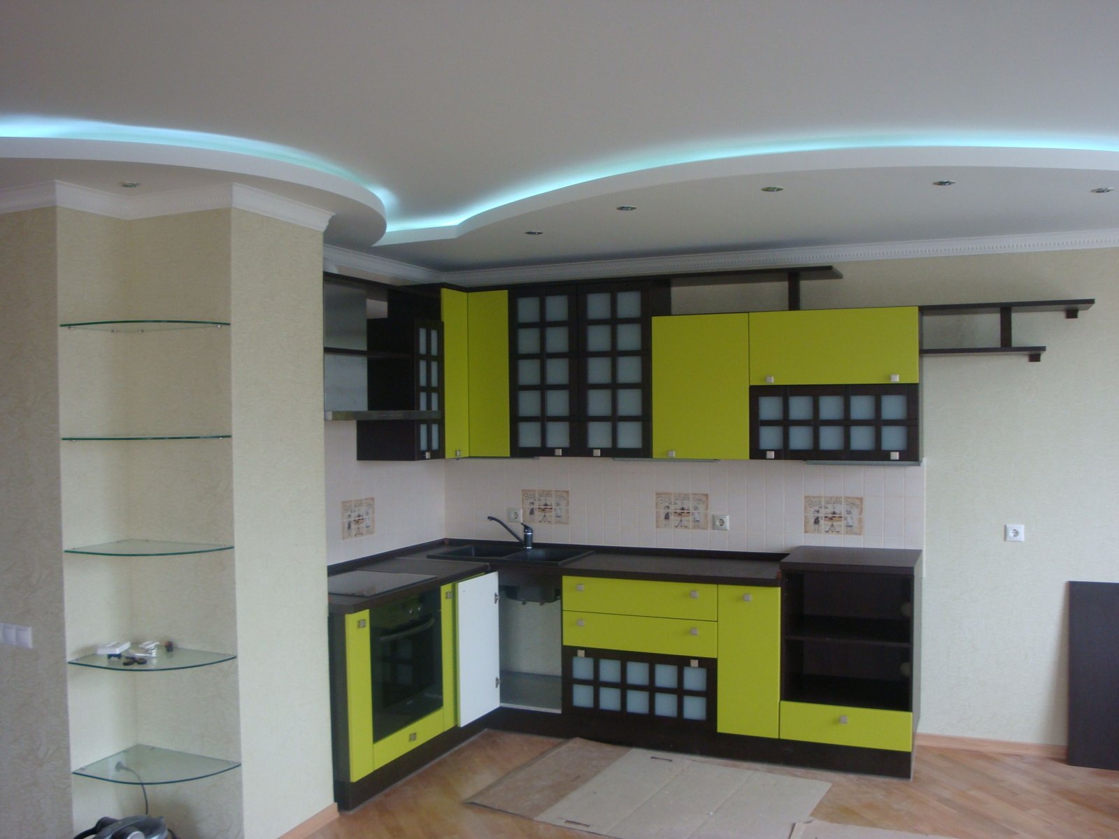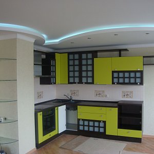 Стильная кухня лаконична и элегантна, все детали продуманы до мелочей. Грамотная организация пространства, различные варианты освещения, эргономичная мебель – все нацелено на создание удобной и комфортной обстановки. Двухуровневый потолок необычной формы с подсветкой и встроенный стеллаж со стеклянными полками зрительно преображают помещение, подчеркивая его индивидуальность.