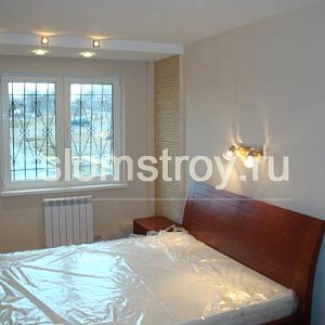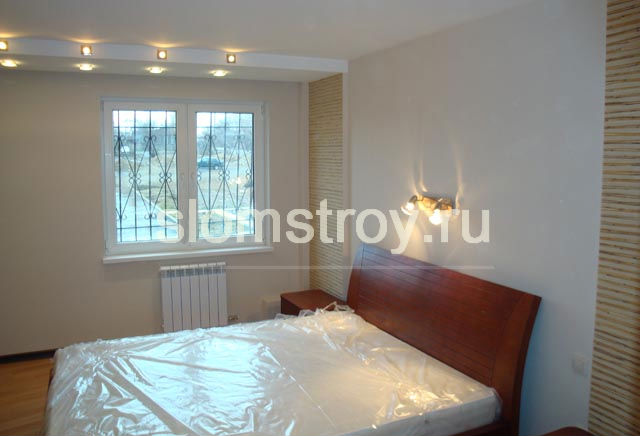 В спальне стены окрашены в спокойные цвета, для отделки использовались разнофактурные обои. Многоуровневое освещение позволяет регулировать его интенсивность и направленность. Установлена оригинальная кровать с изогнутой спинкой и шкаф-купе с ассиметричными зеркальными дверями.
