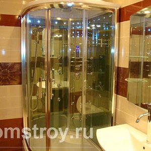 В ванной комнате использована комбинация плитки двух цветов: белого и терракотового. Четкие линии, стеклянные и металлические детали, выбранные для оформления санузла, - неотъемлемая часть стиля хай-тек.