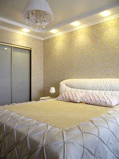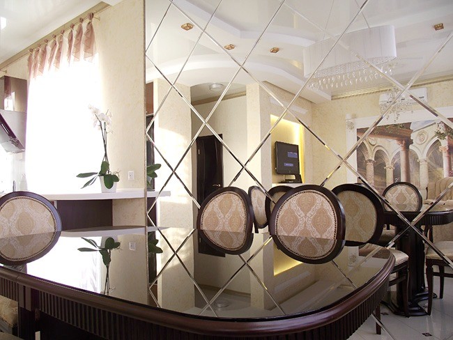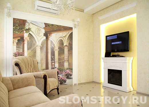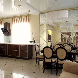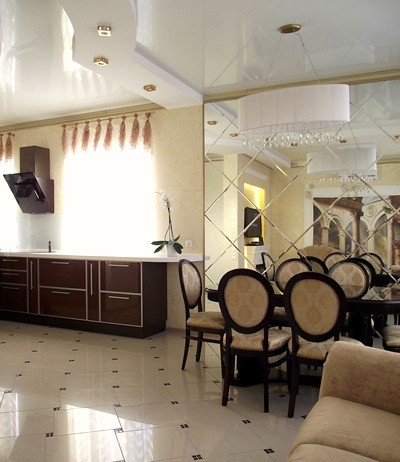 Планировкой предусмотрена кухня-гостиная и спальня. Интерьер гостиной с помощью освещения поделен на зоны, но сохраняет единое стилевое оформление. Панно на стене с дополнительной подсветкой и отделка зеркальной плиткой визуально увеличивают пространство, а электрический камин создает в комнате атмосферу уюта и комфорта. Спокойная цветовая гамма располагает к отдыху и созерцанию. Светлая мебель подчеркивает элегантность и утонченность обстановки.