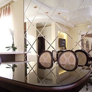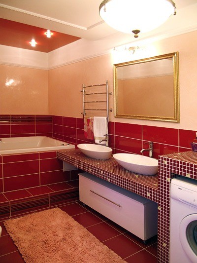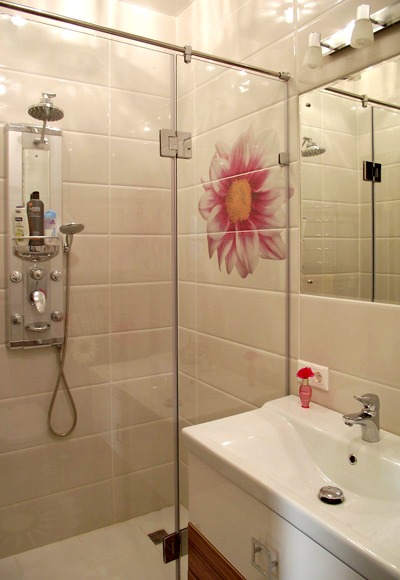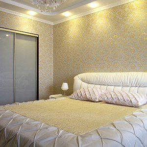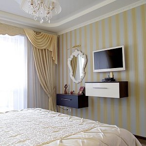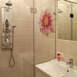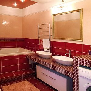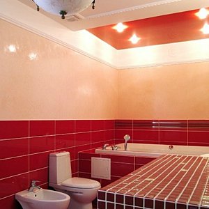 Для пола использована итальянская глянцевая плитка с рисунком, она смотрится эффектно и, благодаря отражению света, также придает комнате дополнительный объем. Минимализм спальни предполагает оформление в спокойных выдержанных тонах и наличие только необходимых предметов интерьера. На контрасте с жилой зоной, санузел выполнен в ярких тонах, с использованием облицовочной плитки различных оттенков: от бежевого до ярко-красного. Освещение в квартире центральное и точечное. Установлен кондиционер.