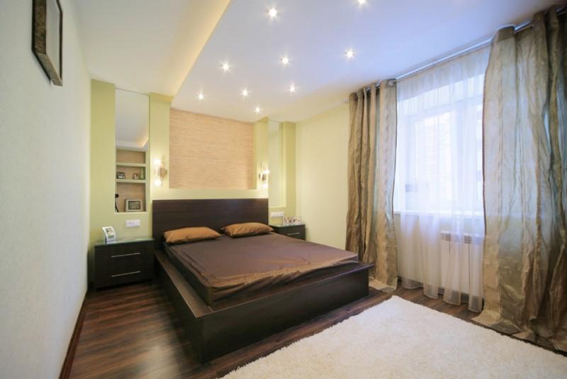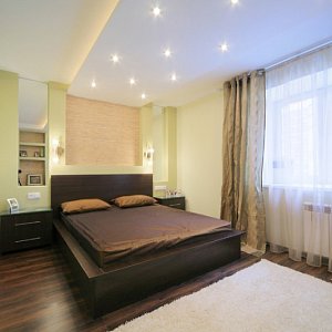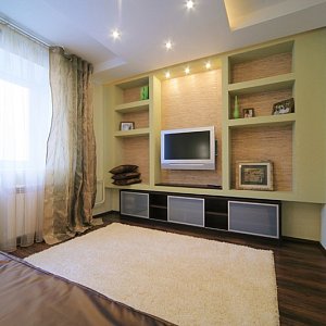 В спальне преобладающие цвета – оливковый и шоколадный. Отличный выбор для любителей классики. Белый ковер выгодно выделяется на этом фоне и создает спокойную умиротворяющую атмосферу в комнате. Стеллажи, выполненные из гипсокартона, оживляют обстановку и очень удобны. Воздушные занавески на окнах легки и изящны.