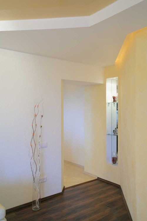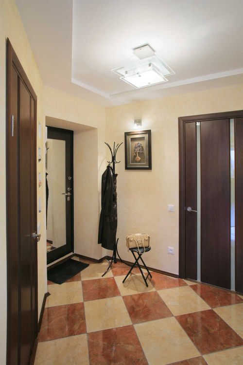 В коридоре доминирует модная клетка – символ упорядоченности и гармонии. Глянцевая напольная плитка шоколадного оттенка отлично сочетается с более насыщенным цветом межкомнатных дверей. Нестандартная форма помещения искусно обыграна с помощью декоративных ниш и разноуровневого потолка с дополнительной подсветкой.