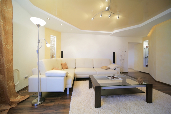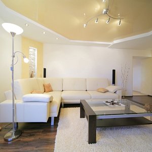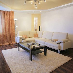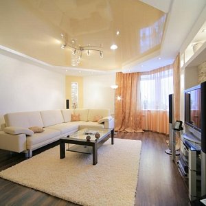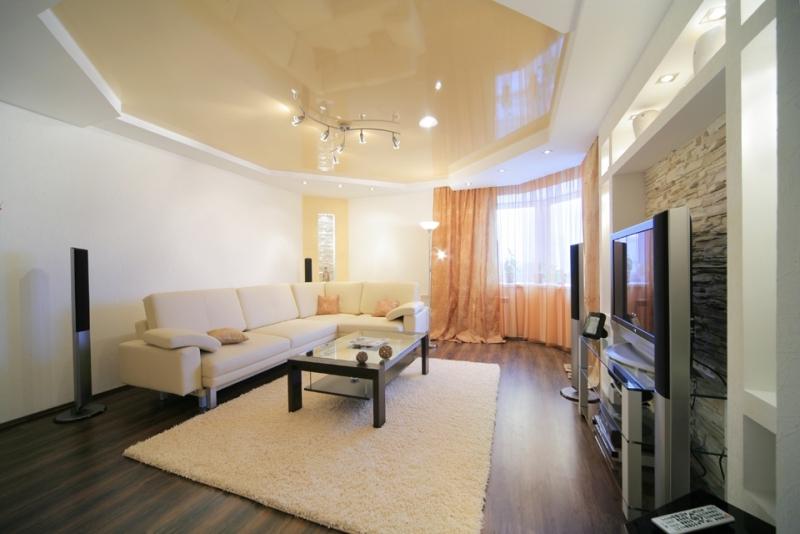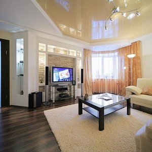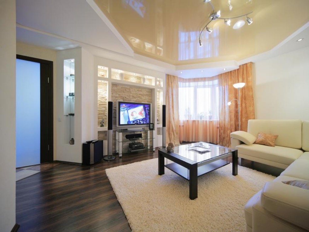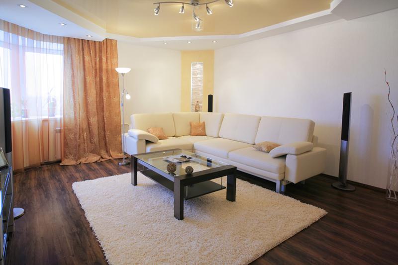 Для пола в гостиной выбран ламинат «Темный орех» (Германия), обои без рельефа, окрашенные в белый цвет, произведен монтаж глянцевого натяжного потолка молочного оттенка. Черный журнальный столик, светлая мебель, белый ковер и персиковые занавески расставляют нужные акценты и смотрятся очень эффектно.