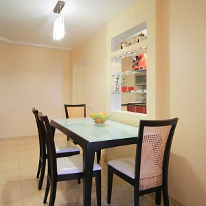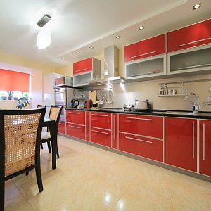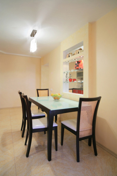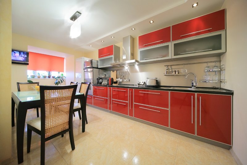 В кухне нейтральный бежевый пол и потолок контрастируют с активным красным цветом гарнитура и жалюзи. Обеденная группа поддерживает общую цветовую концепцию отделки помещения. Место приема пищи выделено рельефной стеной с полочками для мелочей.