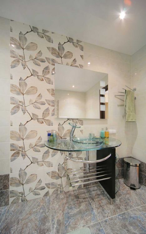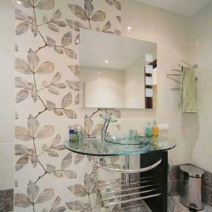 В санузле выбрана напольная плитка под камень. Для стен - бежевая плитка однотонная и с декоративным рисунком.