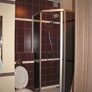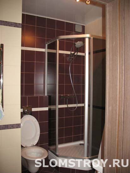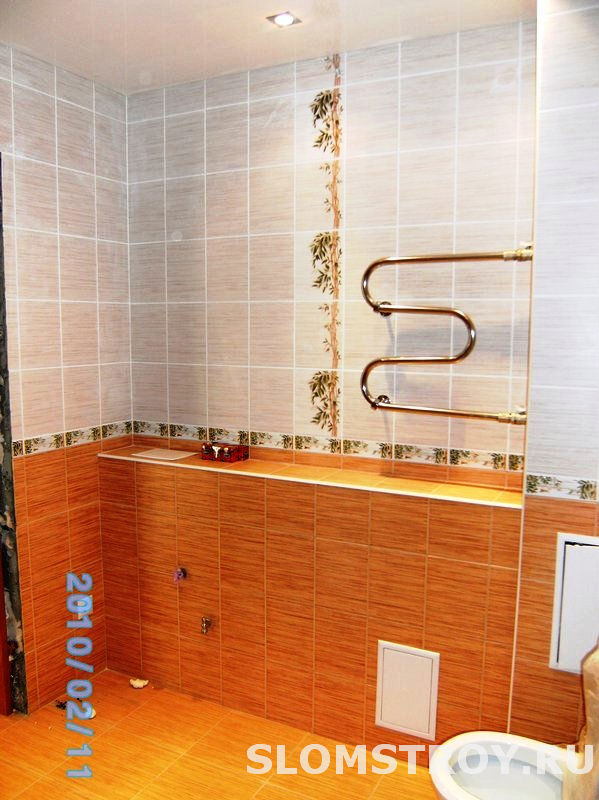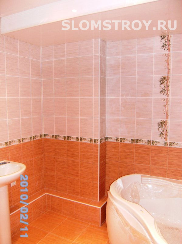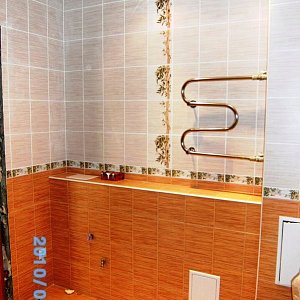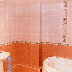 При отделке ванной комнаты выбор сделан в пользу итальянской облицовочной плитки «Оранж», «Твид» и «Шоколад», были использованы элементы мозаики. Напольное покрытие – ламинат Сосна (Германия).