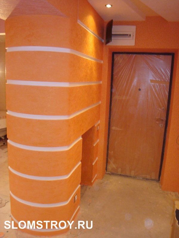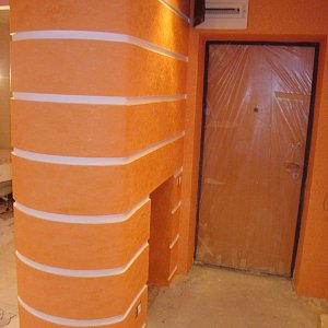 Отделка выполнена в ярких жизнеутверждающих оттенках. Современный стиль, обилие естественного освещения и дополнительная подсветка создают неповторимую атмосферу летнего солнечного дня. Оранжевый цвет присутствует практически в каждом помещении. Энергичный и доминирующий в прихожей, нежно-персиковый в кухне и комнате, активный и теплый в спальне, бодрящий и заряжающий хорошим настроением в ванной комнате.
