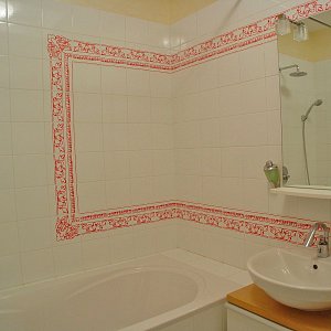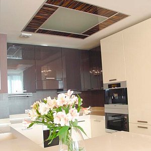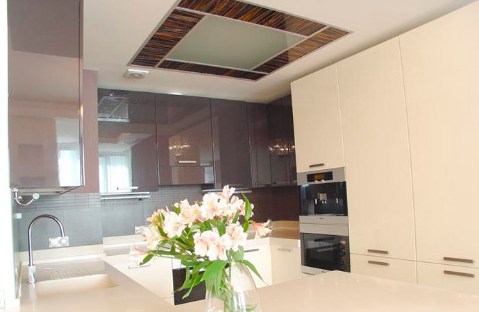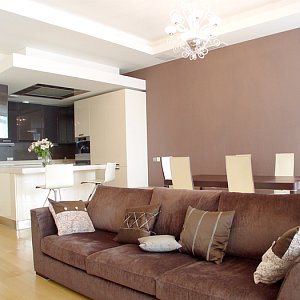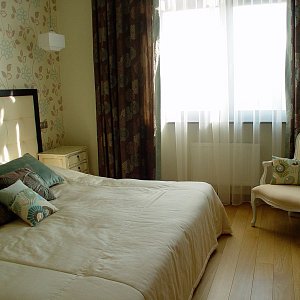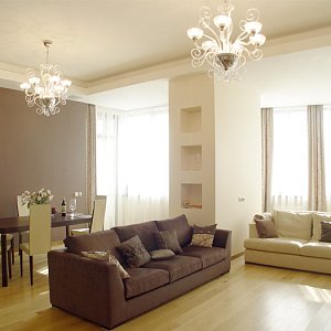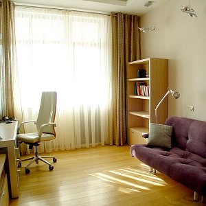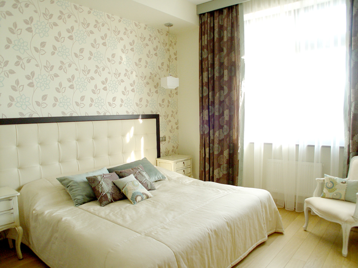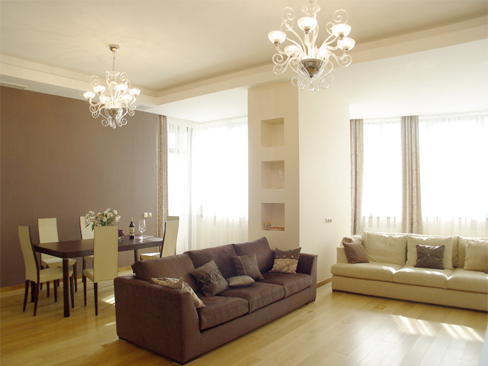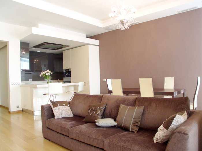 Первым этапом работы стало выделение основных зон в квартире со свободной планировкой. В результате получились просторная кухня-гостиная, две спальни и комната для подростка. В квартире выдержана общая концепция цвета, за основу взят белый тон, классический в гостиной и переходящий в молочный в спальне. Идеальный вариант для дополнения яркими красками в виде мебели и аксессуаров. Для контраста стена в гостиной покрашена в один из оттенков бордового, в цвет с одним из комплектов мягкой мебели. Потолки – гипсокартон с точечной подсветкой и оригинальными люстрами. Полы – ламинат под бук, в санузле керамогранит.