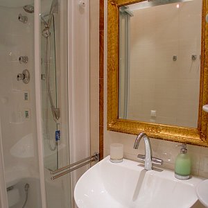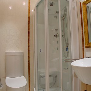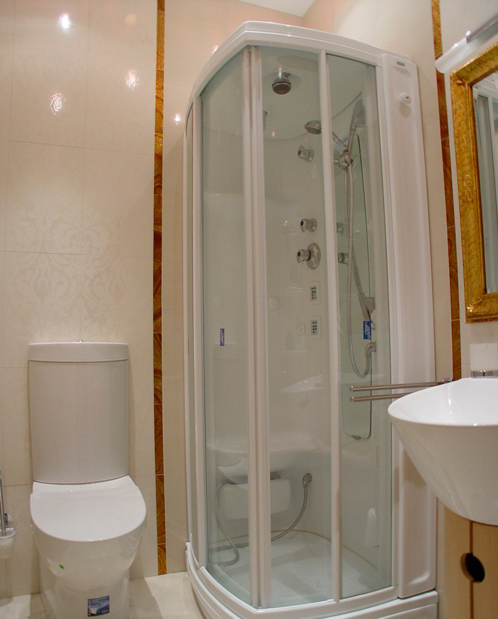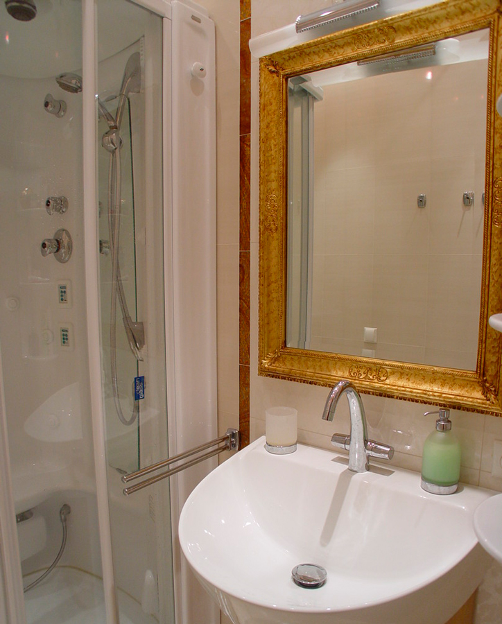 Белая облицовочная плитка в санузле прекрасно гармонирует с белой сантехникой и отделкой под золото.