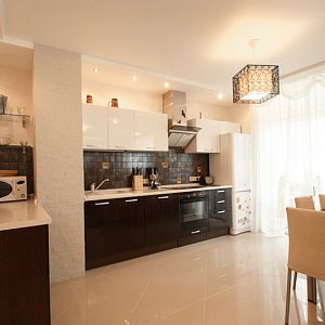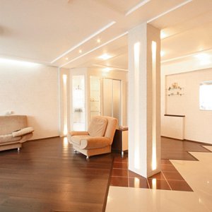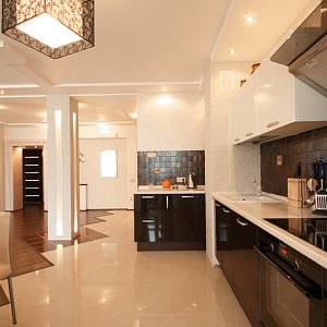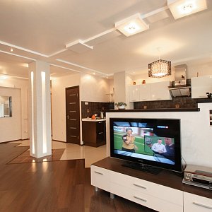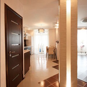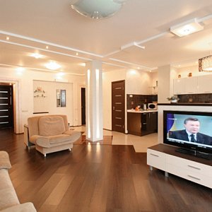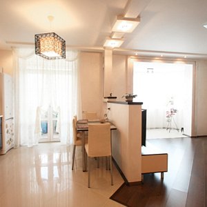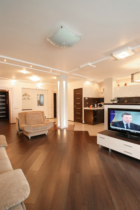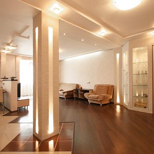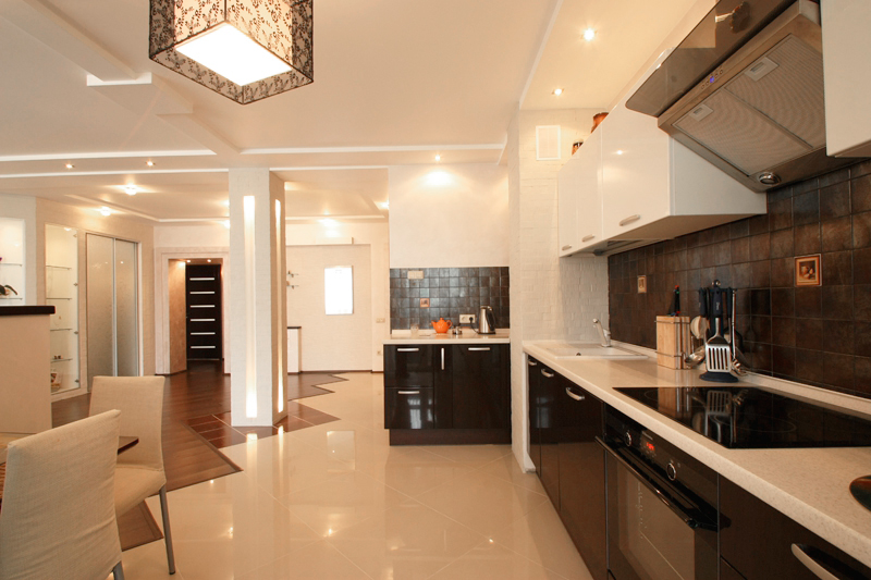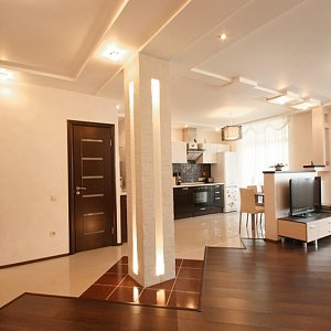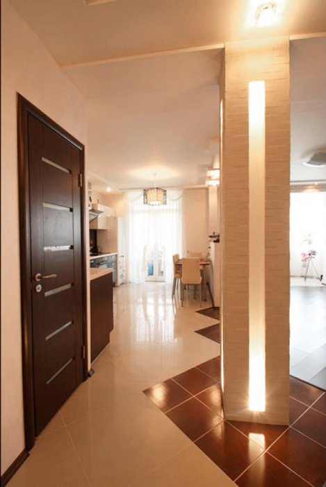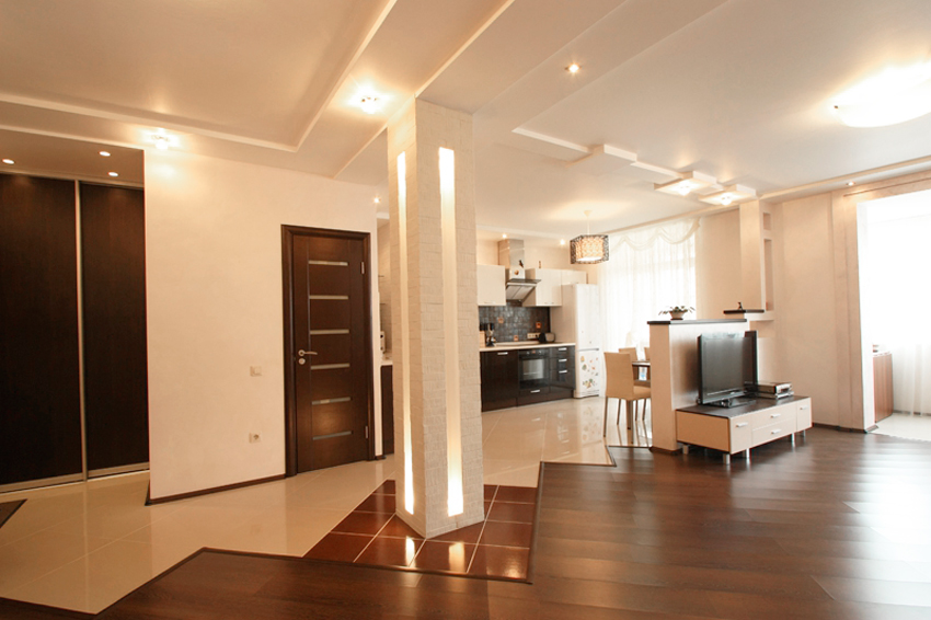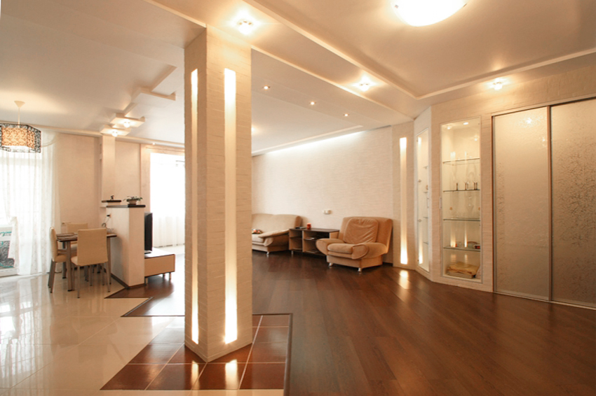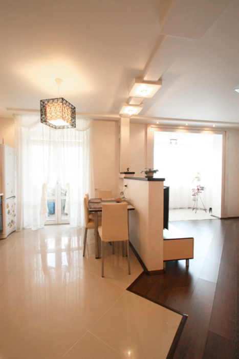 В кухне-гостиной зонирование осуществлено с помощью различных дизайнерских приемов. Для визуального разделения пространства на кухонную зону и место для отдыха использованы разные типы напольных покрытий (ламинат, плитка). Колонна и перегородка из гипсокартона, также выполняют функцию разграничения помещения. Световое оформление и цветовые контрасты завершают картину.