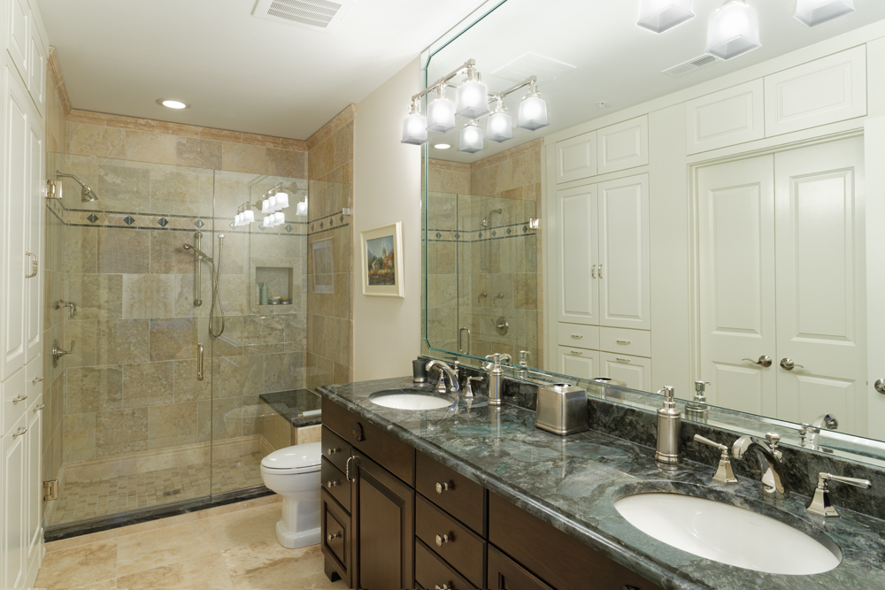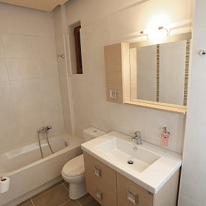 В квартире два санузла. В первом акцент сделан на контрасте цветов, для отделки использована белая и оранжевая глянцевая плитка с элементами мозаики. Второй выполнен в более сдержанных тонах, для стен выбрана белая и терракотовая плитка. В обоих санузлах для экономии пространства установлены угловые ванны.