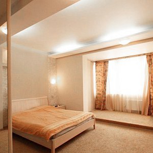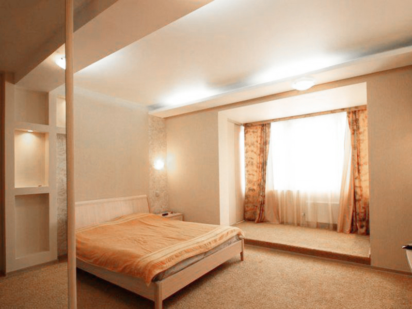 Для спальни выбраны теплые золотистые тона различной интенсивности. Потолок и стены светлые, для них использовались разные по текстуре обои близкой тональности. Пол более темный, насыщенный золотой. Занавески, покрывало на кровати и другие аксессуары подобраны в той же цветовой гамме. Балконный блок демонтирован, лоджия выделена отдельной зоной с помощью цвета и установки подиума, на ней разместился туалетный столик с зеркалом. Стеклянная перегородка, светлая мебель и хорошая освещенность создают в комнате атмосферу легкости и невесомости.