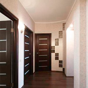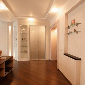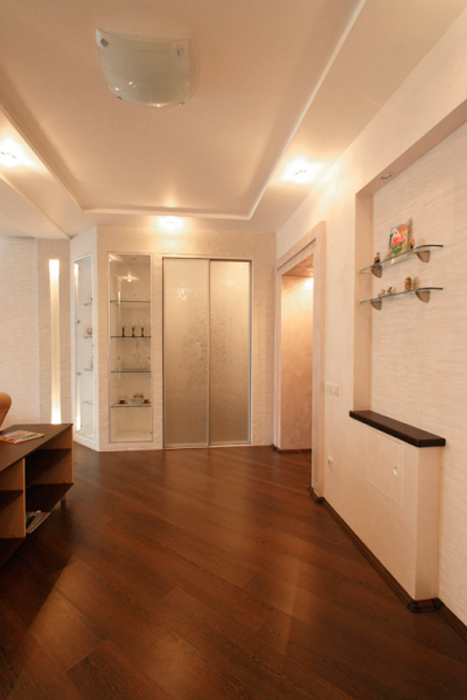 В коридоре за основу взят светло-розовый тон, который при разном освещении может варьировать от бежевого оттенка с розоватым отливом до холодного пурпурно-розового. Стена декорирована стеклоблоками.