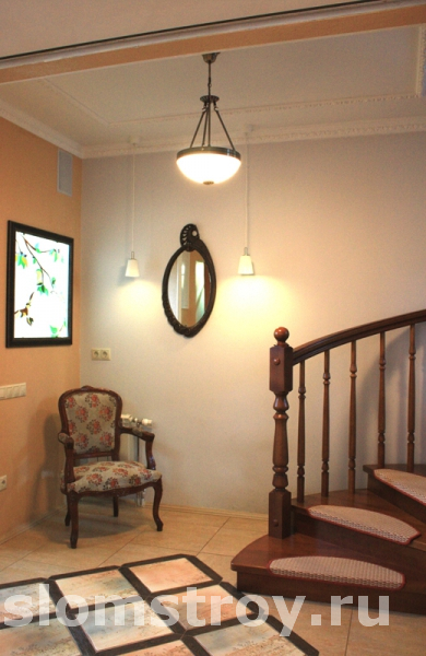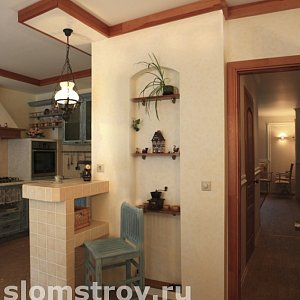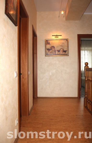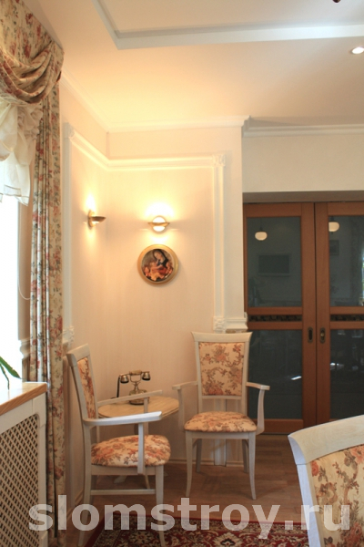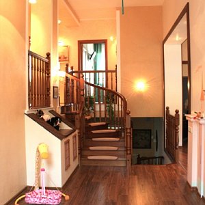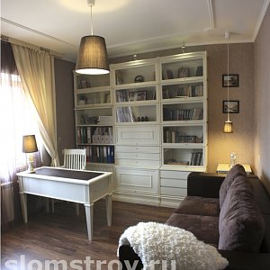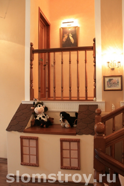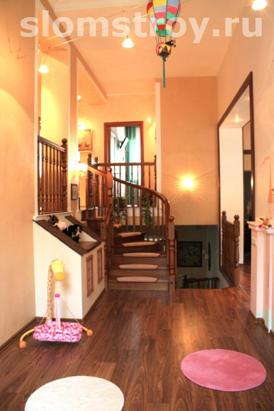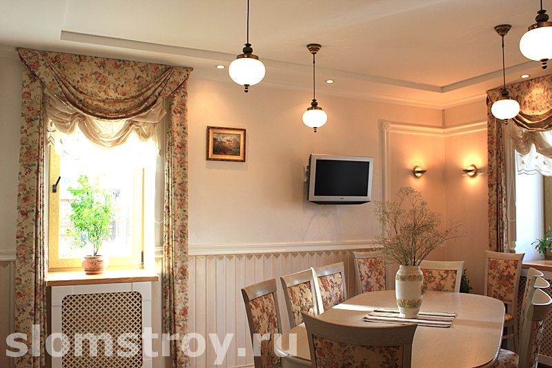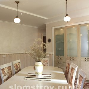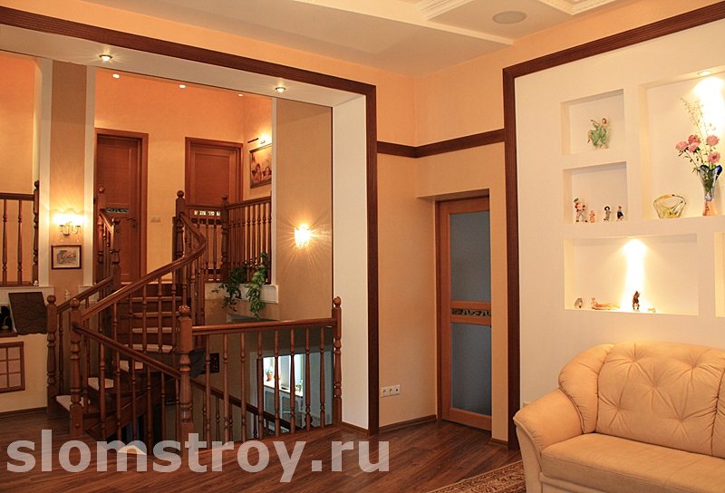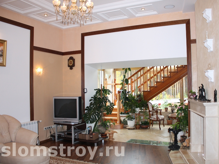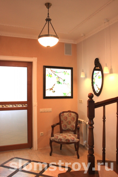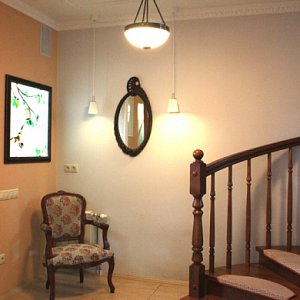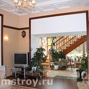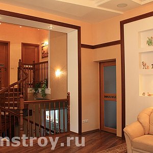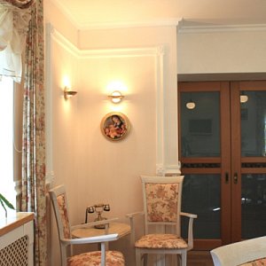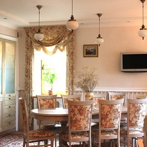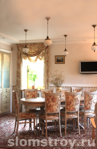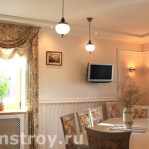 Отделка коттеджа выполнена в классическом английском стиле с элементами кантри. Большое количество дерева, сочетание тёмной паркетной доски и тёмных декоративных элементов привносит строгую элегантность. А использование кантри-мотивов и светлой цветовой гаммы в обеденной зоне и зоне отдыха создает непринужденное настроение. Потолки сложной формы, использование полиуретановой лепнины на стенах и потолках - сложная геометрия декоративных элементов подчеркивается продуманным освещением.