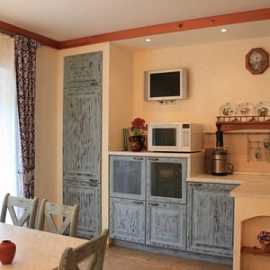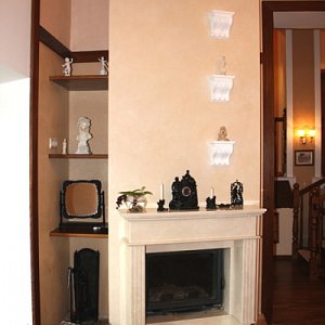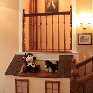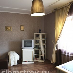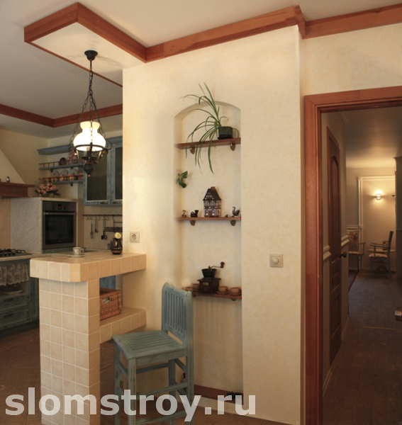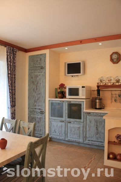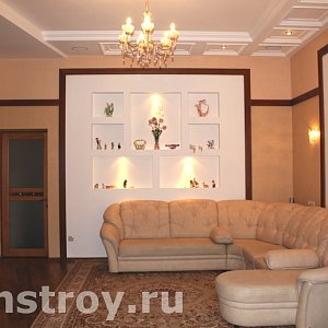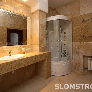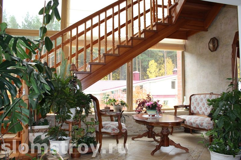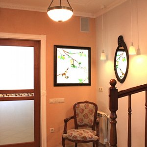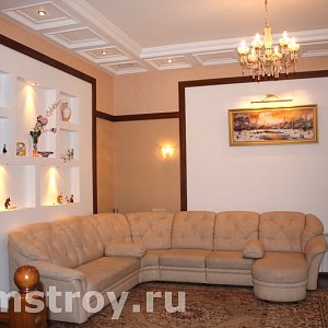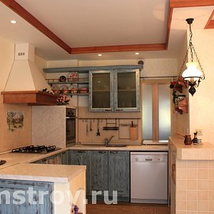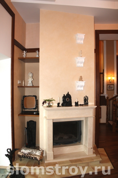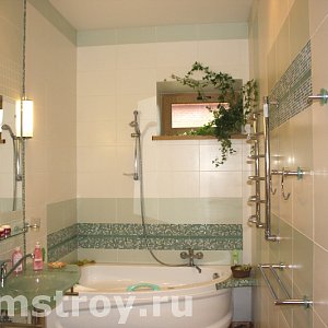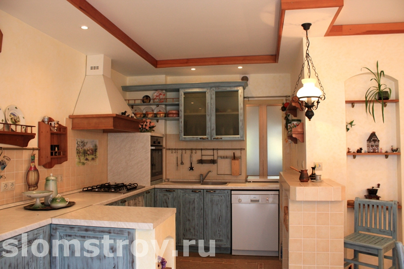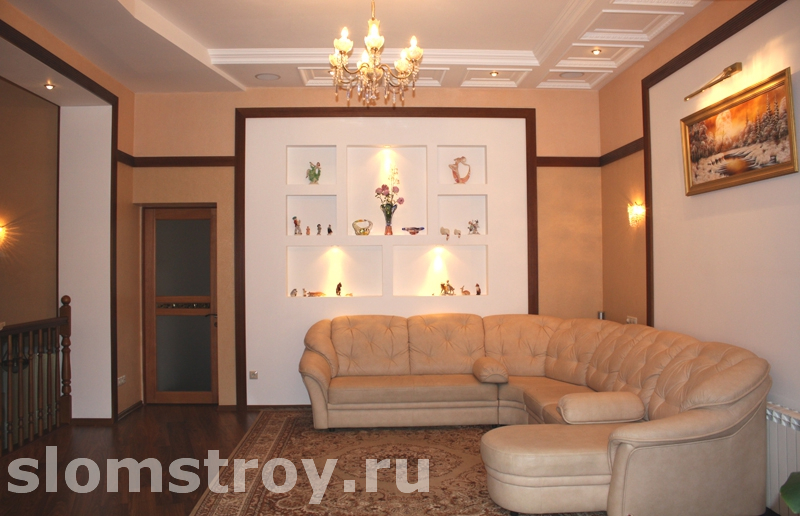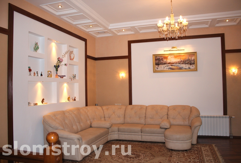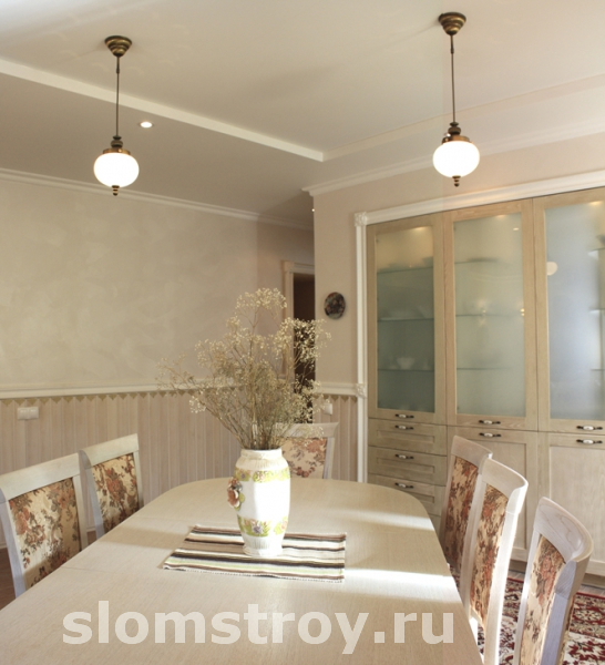 Отделка коттеджа выполнена в классическом английском стиле с элементами кантри. Большое количество дерева, сочетание тёмной паркетной доски и тёмных декоративных элементов привносит строгую элегантность. А использование кантри-мотивов и светлой цветовой гаммы в обеденной зоне и зоне отдыха создает непринужденное настроение. Потолки сложной формы, использование полиуретановой лепнины на стенах и потолках - сложная геометрия декоративных элементов подчеркивается продуманным освещением.
