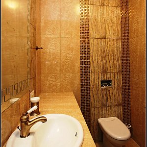Смена английского мотива заметна только в комнате индивидуального отдыха: заказчик пожелал уйти от классики в сторону модернизма.