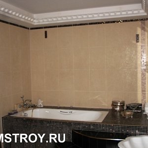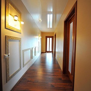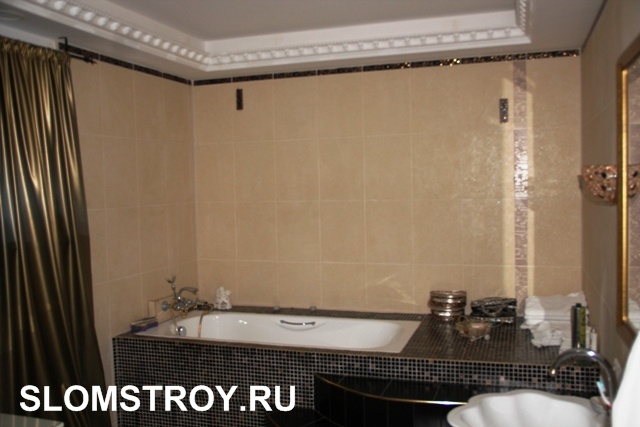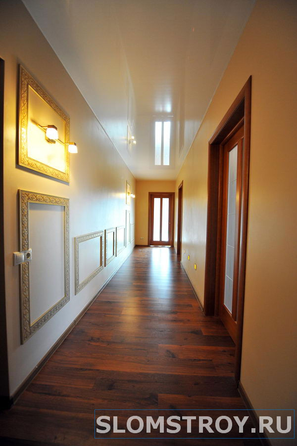 В отделке коридоров используется имитация лепнины на стенах для создания декоративных рамок. Ванная с джакузи и бассейн декорированы орнаментом из мозаики.