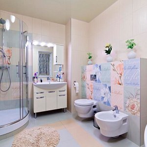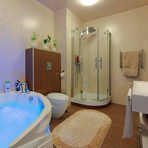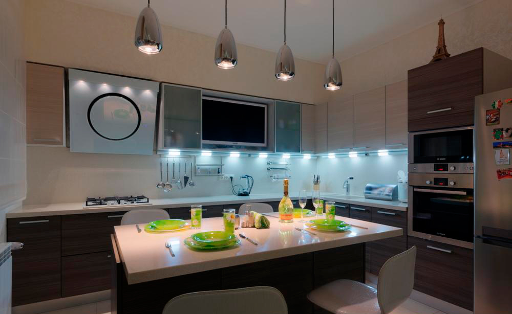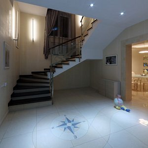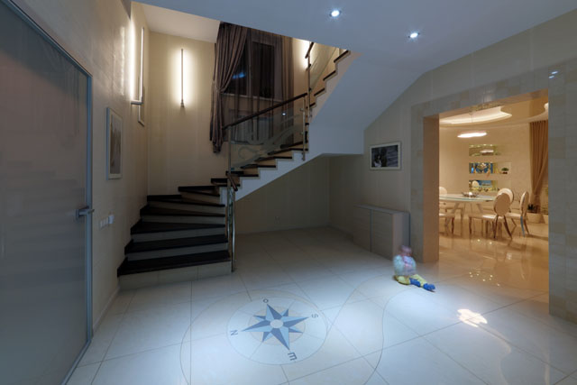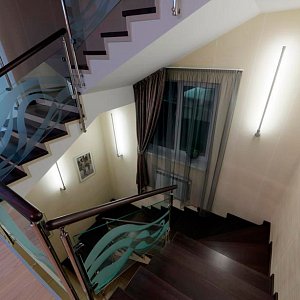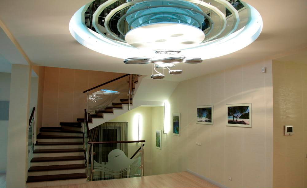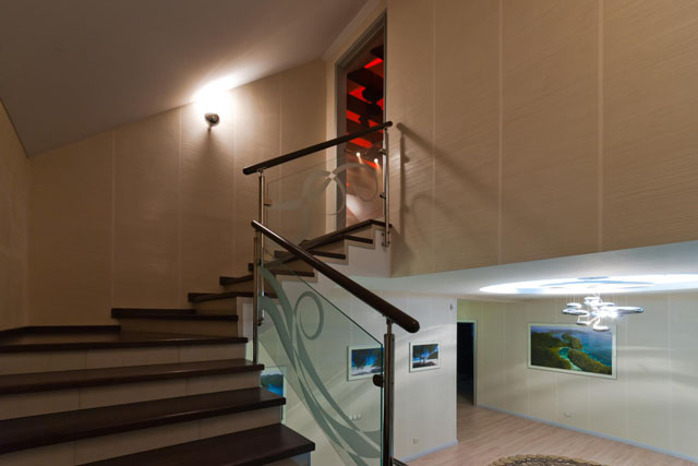 Отделке интерьера в стиле постмодернизм характерно сочетание металла, плитки, дерева, стекла - всё это использовано в работе над коттеджем, наряду с современными композитными материалами.