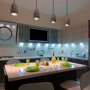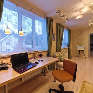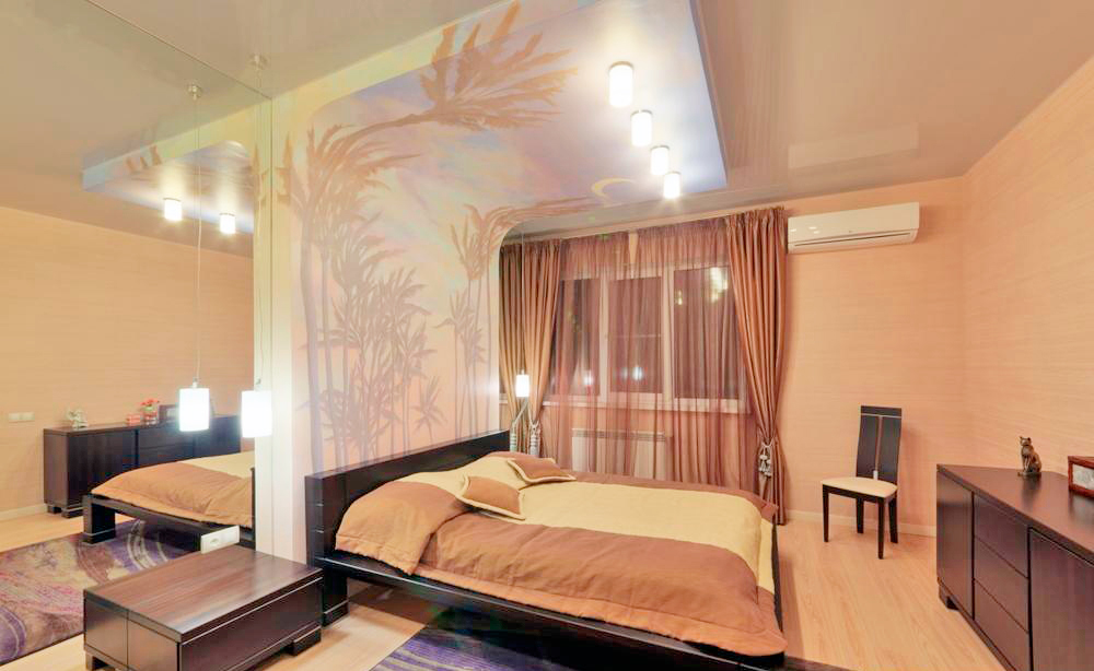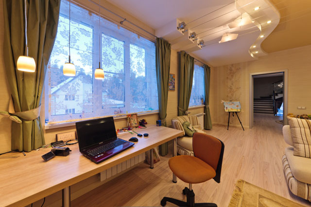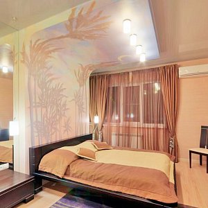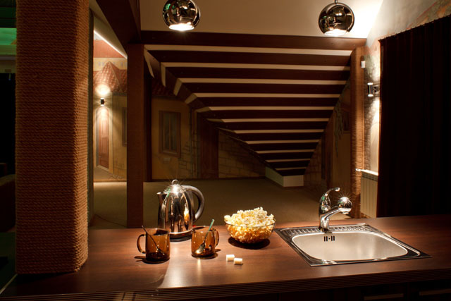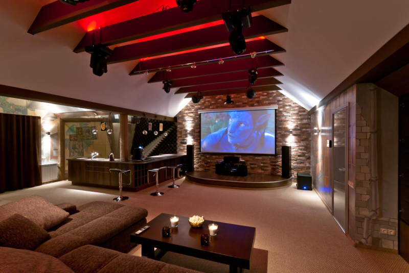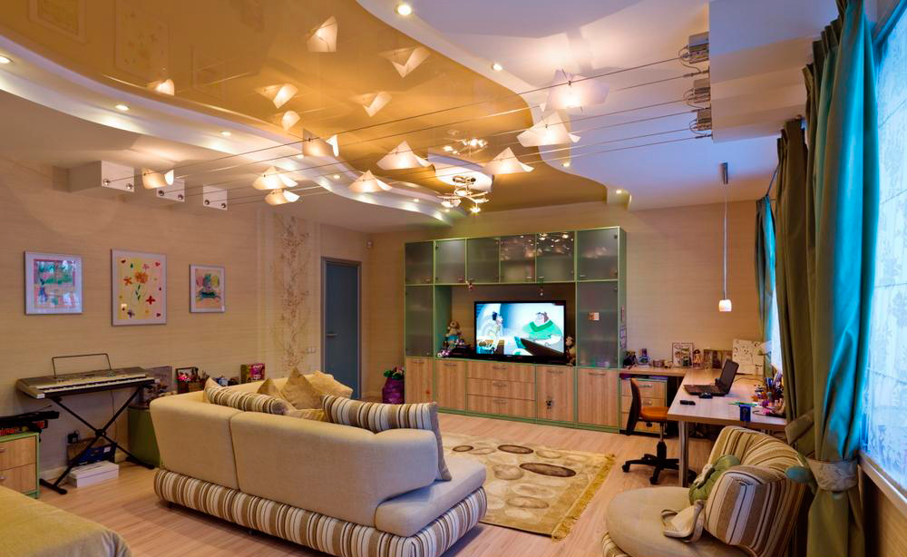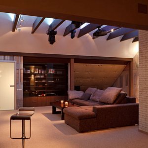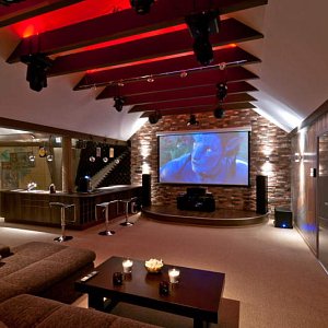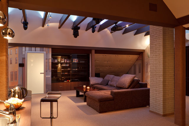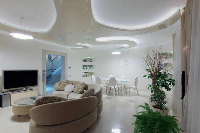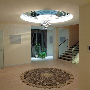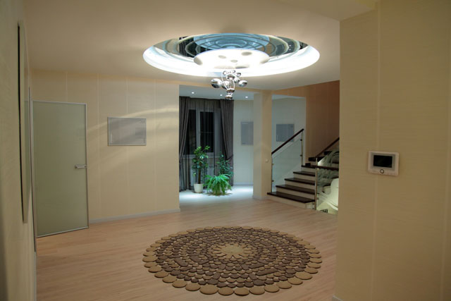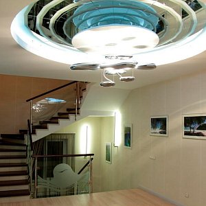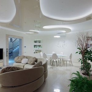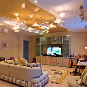 Еще один яркий пример постмодернизма в интерьере. Мягкое покрытие пола, отделка некоторых стен и колонн декоративным камнем, и сложная геометрия потолка со встроенной иллюминацией - черты современного архитектурного стиля делают интерьер красивым, интересным и функциональным.