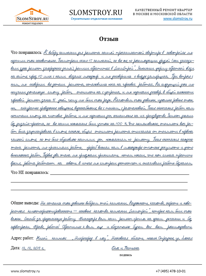 Компания приглянулась еще с момента просмотра сайта, т.к. он очень информативный. С момента заявки на вызов сметчика до подписания договора прошло ровно 2 дня. Порадовала стоимость ремонта в целом и скорость работы команды «SlomStroy». Со следующего дня, после подписания договора, уже доставили материал и приступили к работе!!!Очень быстро! Ремонт был готов уже через 2,5 месяца..