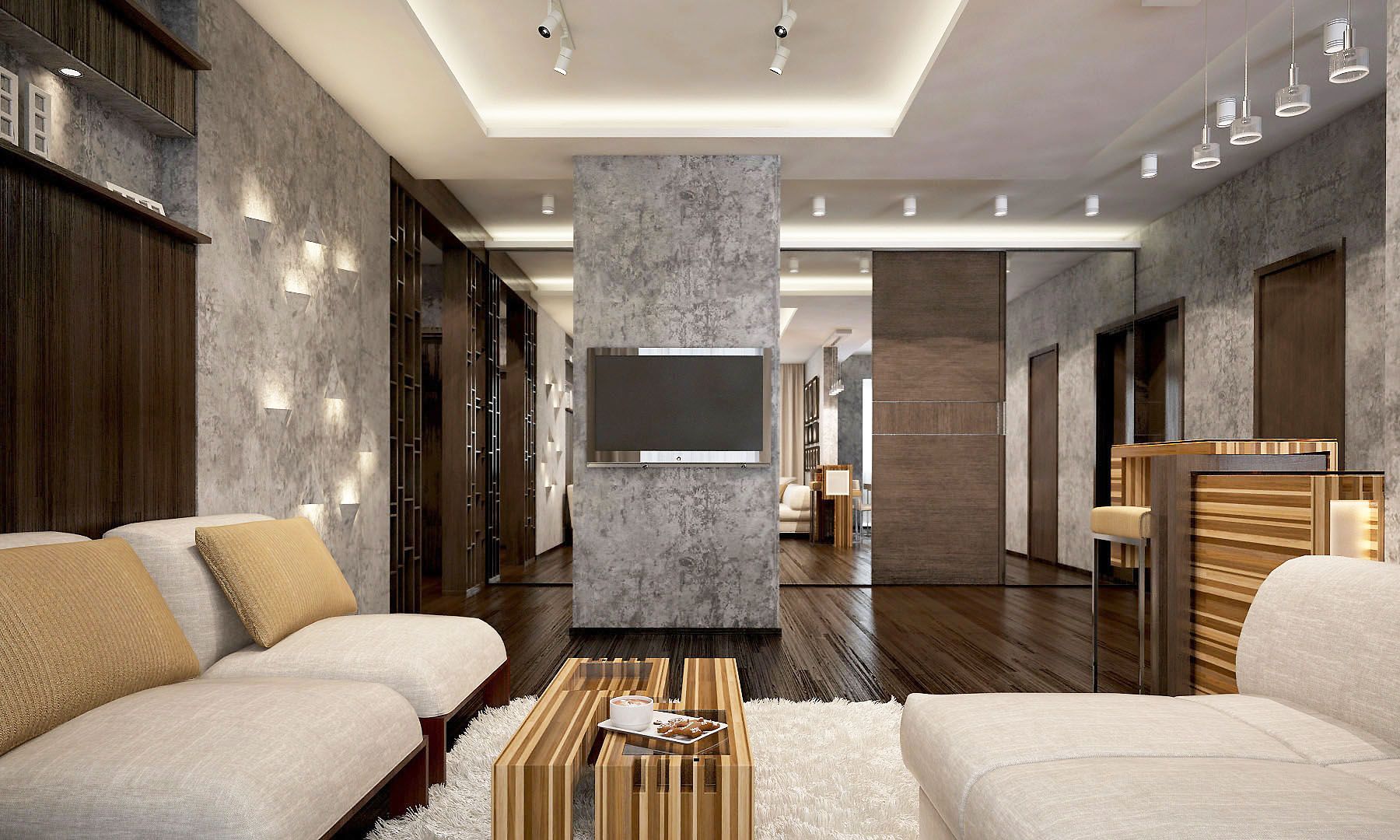 Включает в себя весь комплекс работ по отделке, с применением сложных дизайнерских решений, с использованием дорогих отделочных материалов и инженерных систем.